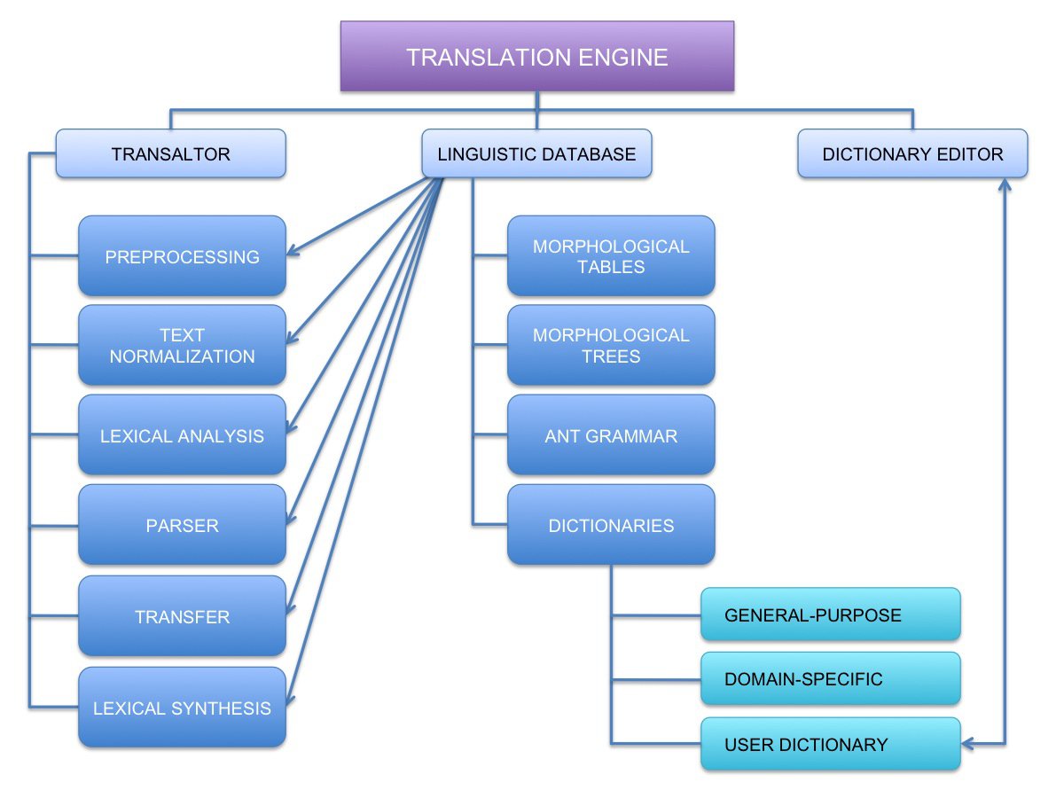 Транслятор работает по методу Transfer на основе правил перевода (rule-based), которые описываются графами специального типа – ATN (Augmented Transition Network Grammar) и используют синтаксические и семантические признаки для вычисления перевода. Основные компоненты транслятора в общем виде: