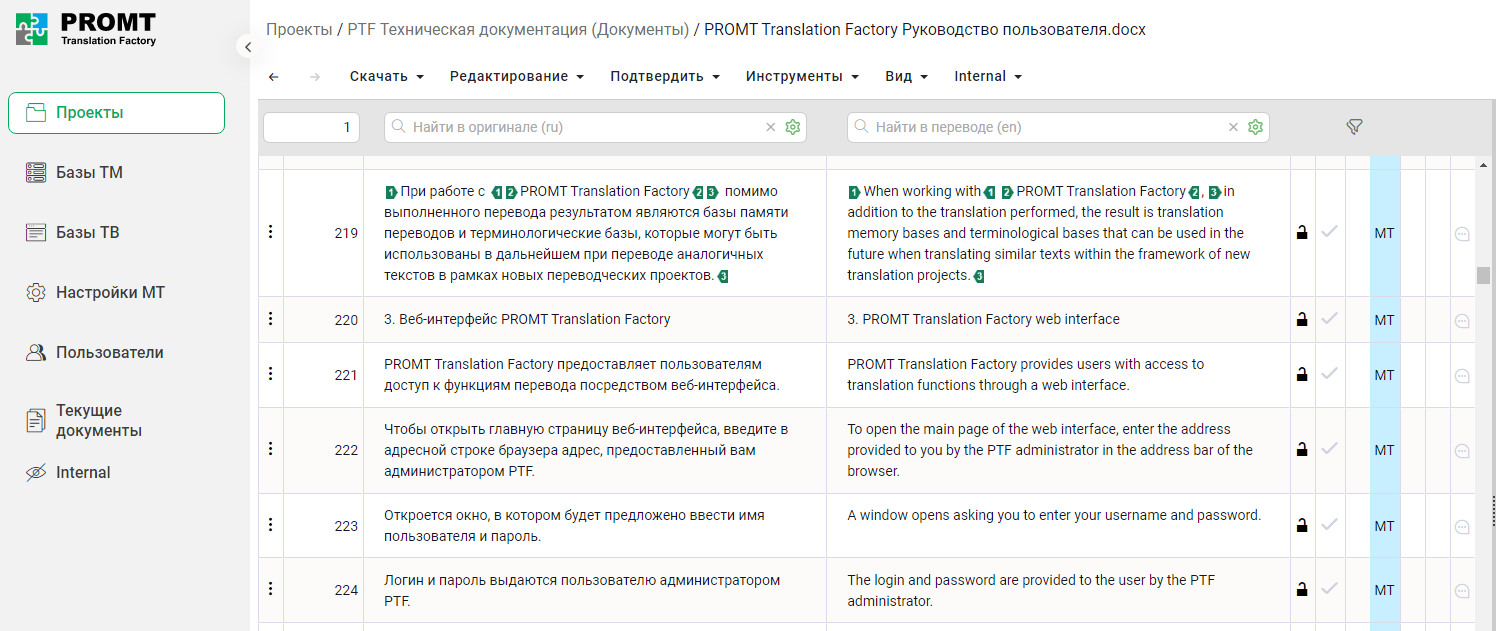 Возможность обучать PROMT Neural Translation Server – одно из определяющих преимуществ продукта. Вы можете адаптировать машинный перевод под специфику вашей компании, используя не только лексическую настройку (интеграция корпоративных глоссариев), но и проводить полноценное обучение на собственных данных с помощью PROMT Custom AI. Благодаря этому, можно создать индивидуальную нейронную модель перевода, которая учитывает специфику корпоративной документации и обеспечивает максимально точный и единообразный результат.